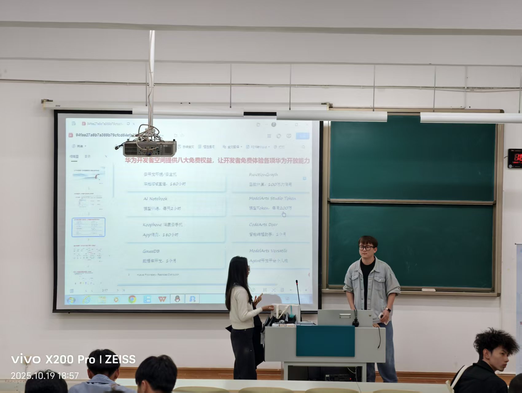教学场景融合: 华为云主机作为实战化实践平台,成功嵌入计算机专业课程体系。在专业教师的协同指导下,HCSD 校园大使左俊男及其团队在课堂上完成了从学生专属通道申请、Ubuntu 环境配置到基础应用部署的全流程演示,将原本抽象的云技术理论转化为可操作、可感知的云端实践,极大地提升了学生对技术原理的理解度与学习兴趣。