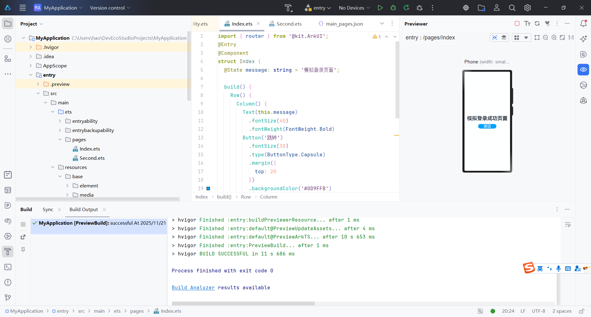 最后介绍下创建工程后自动生成的ets文件,为什么叫ets呢?ets是鸿蒙的ArkTS语言源码文件后缀,专为声明式UI开发设计。它基于TypeScript扩展,添加了ArkUI特有的语法(如组件装饰器、状态管理),用于描述界面布局、样式和交互逻辑。ets中的“e”代表“Extended”(扩展)。