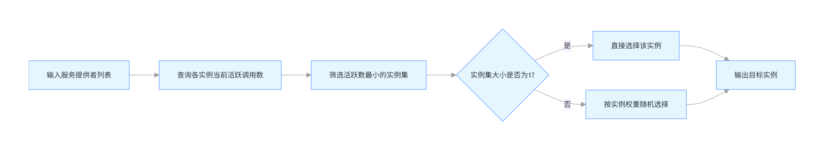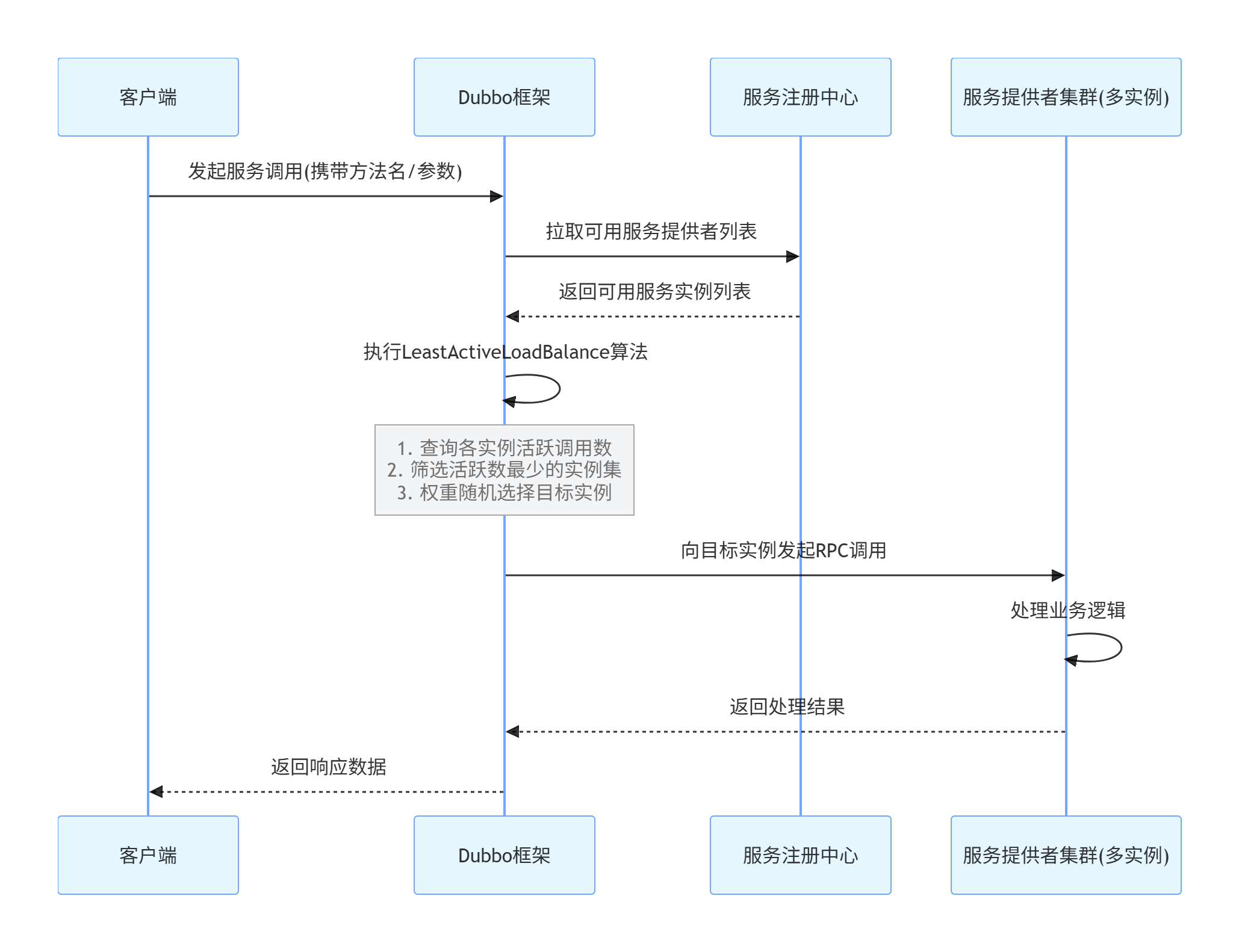 最少活跃调用数算法选择当前活跃调用数最小的服务提供者处理新的请求。这里的“活跃调用数”是指正在处理中的请求数量。该算法旨在将请求分配给负载最轻的服务节点,从而提高整体的服务响应速度。