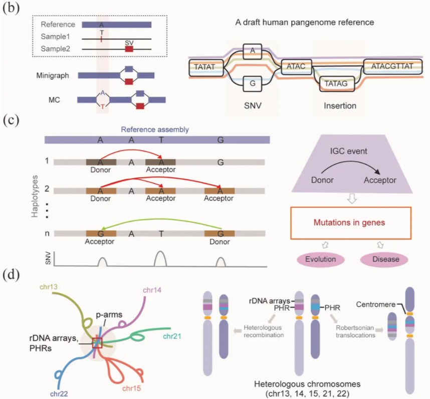 Guarracino et al.(2023)通过泛基因组图谱发现:13、14、15、21、22号染色体的p-臂因富含rDNA阵列与伪同源区(PHRs),在减数分裂中易发生非同源染色体间的异源重组(heterologous recombination),直接导致罗伯逊易位(ROBs)——新生儿中发生率约1/800。泛基因组首次精准定位ROBs断点均位于PHRs,从机制上解释了这类常见染色体病的起源。