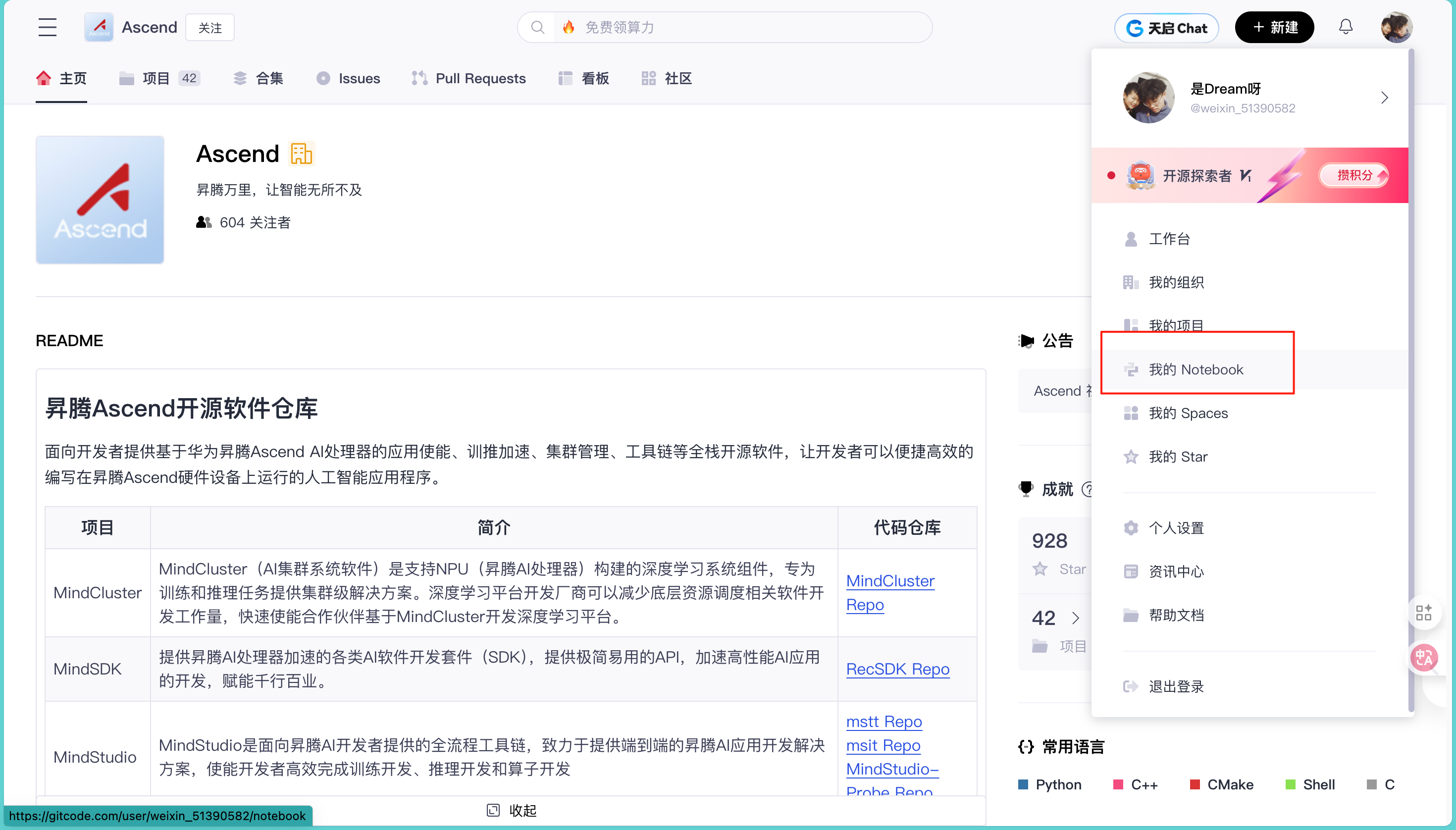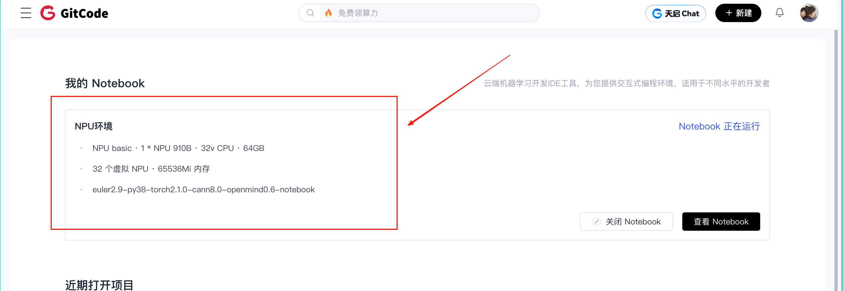 首先,在 GitCode 首页中进入个人控制台,点击上方的 “Notebook 工作区”,进入你的云端开发环境管理页面。