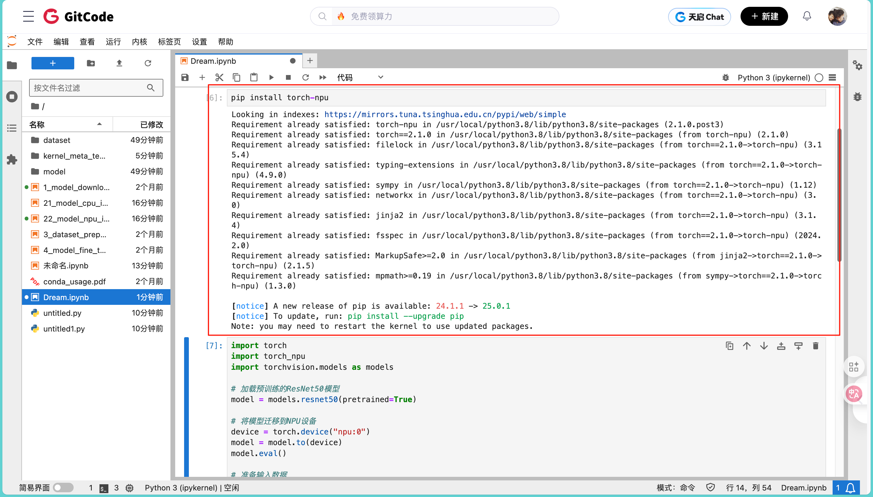 待进入 JupyterLab 环境后,首先需要在昇腾服务器上安装CANN(Compute Architecture for Neural Networks)开发套件,配置PyTorch适配插件torch_npu。这里我们新建一个 Python 终端,通过简单的pip命令即可完成安装,这里直接建一个jupyter中的ipynb文件即可,然后进去安装我们的npu,这里使用命令pip install torch-npu: