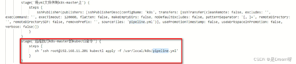 stage('远程执行k8s-master的kubectl命令') {