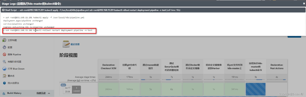 因为pipeline没有改变时,每次不会重新加载,这样会导致Pod中的容器不会动态更新,这里需要使用kubectl的rollout restart命令滚动更新