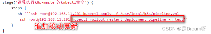ssh root@192.168.11.201 kubectl rollout restart deployment pipeline -n test'''