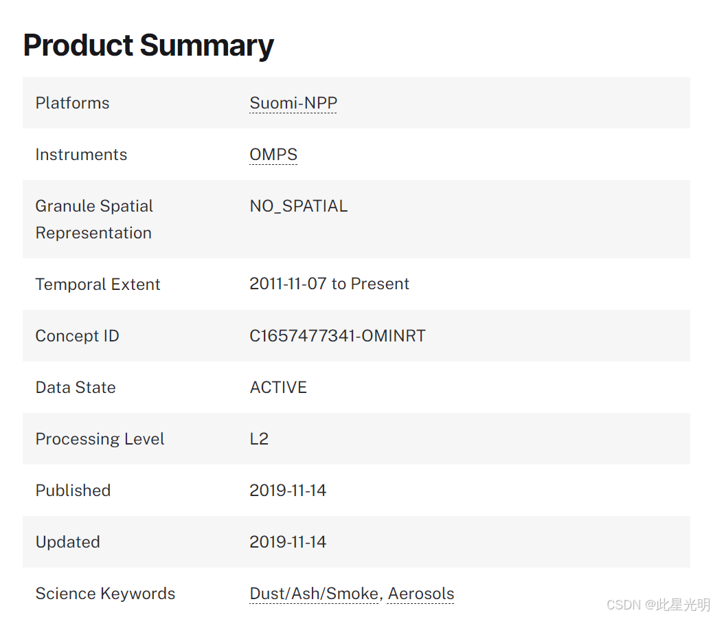 OMPS-NPP L2 NM气溶胶指数条带轨道V2近实时数据。标准产品请参见CMR中的OMPS_NPP_NMMIEAI_L2产品。该气溶胶指数由归一化辐射亮度计算得出,使用340 nm和378.5 nm两对波长。此外,该数据产品还包含归一化辐射亮度、反射率、云量和其他辅助变量的测量值。
