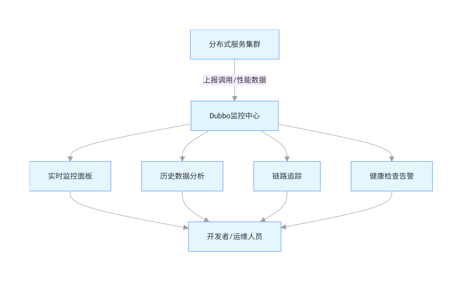 Dubbo 监控中心提供了调用链路追踪功能,可以清晰地展示一次请求从客户端到服务端的完整路径,包括中间经过的所有服务节点。这对于排查问题和优化性能非常有帮助。