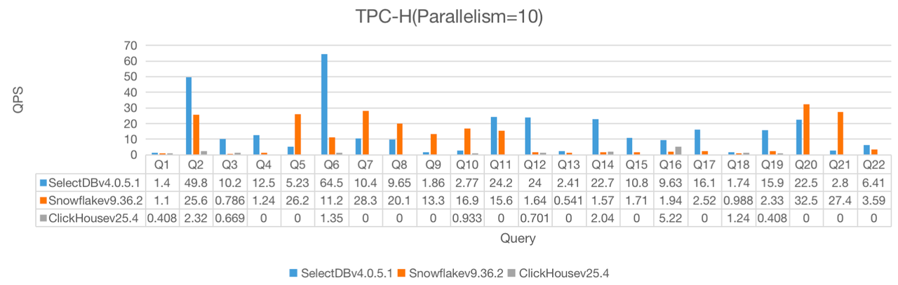 - 由于 ClickHouse 在部分 TPC-H 查询(尤其是 Q20、Q21、Q22)中无法完全支持所需的连接操作,未能获得有效的可比结果,因此在图表中将其设为 0 。