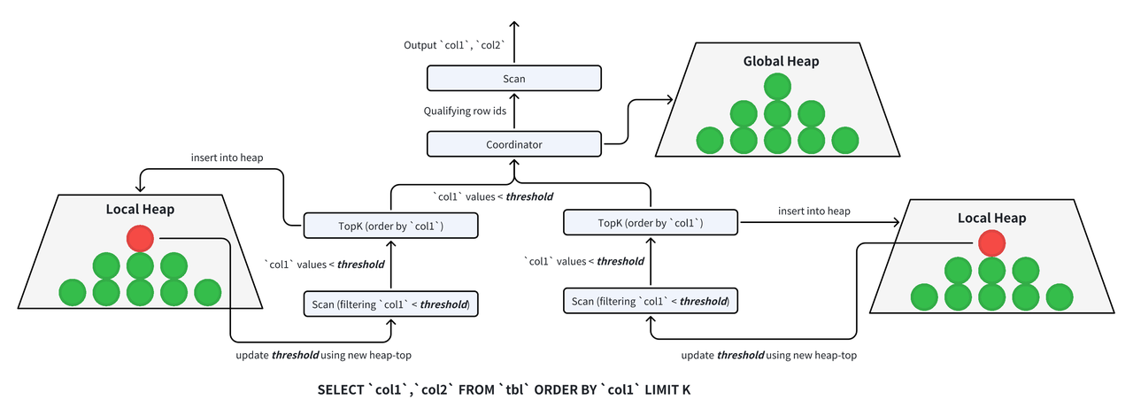 首先,在数据扫描线程中,先对数据局部截断,然后通过全局协调器对数据进行最终排序,并根据排序结果进行全局截断。因此,Doris 的 TopK 查询执行过程实际上分为两个阶段: