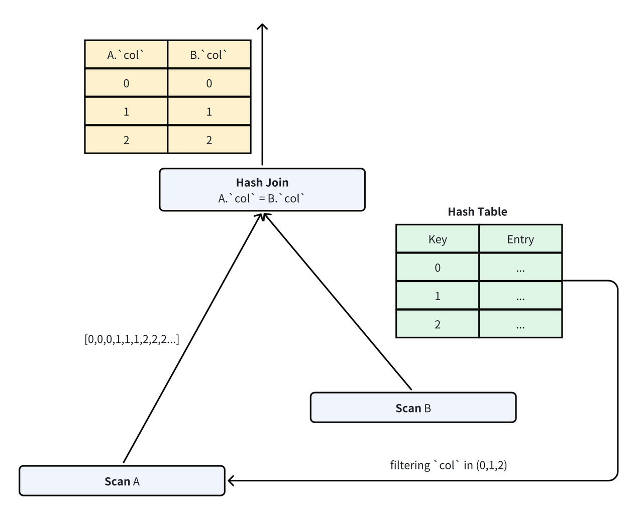 > 10这一谓词过滤器就可在 SQL 解析阶段推导出来。 - 对于包含内等值连接的查询,只有探测侧与构建侧匹配的行才应该被读取。因此,这些过滤器只能在构建哈希表之后生成,称为动态过滤器。