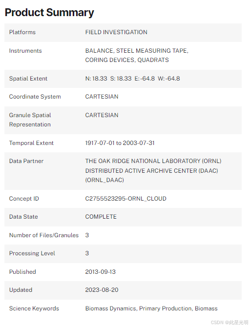 该数据集包含三个 ASCII 文件(.txt 格式)。其中一个数据文件包含基于 16 个永久样地(位于美属维尔京群岛圣约翰岛 132 公顷的肉桂湾流域内,沿海拔(60-290 米)和地形梯度分布)的测量数据,对一片晚期次生湿润亚热带森林的地上生物量、凋落物、凋落物量、食草动物取食量、生物量变化和地上净初级生产力(ANPP)的估算值。该研究旨在提供有关森林结构、物种组成和森林生产力沿环境梯度变化的信息,包括飓风和干旱的影响。另外两个文件提供了附近气象站(1917-1981 年)的气候记录。