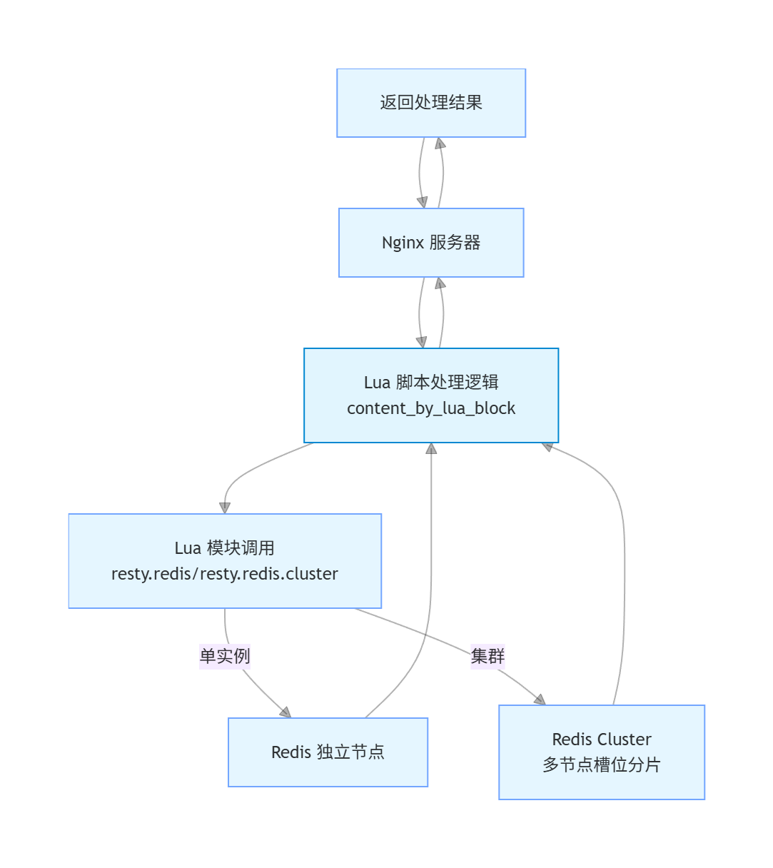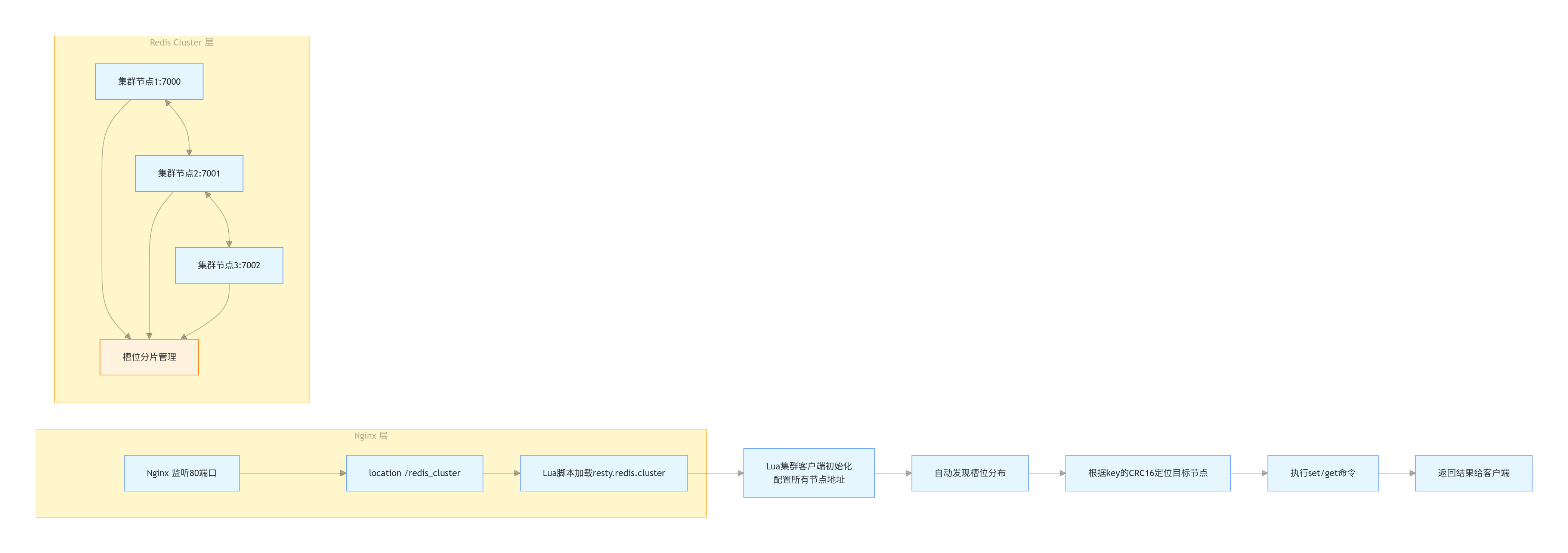 在实际应用中,使用 Nginx 和 Lua 脚本连接 Redis 集群是一种常见的做法,特别是在需要高性能和灵活配置的 Web 服务中。下面是一个具体的示例,展示了如何使用 Nginx 和 Lua 脚本与 Redis 集群进行交互。