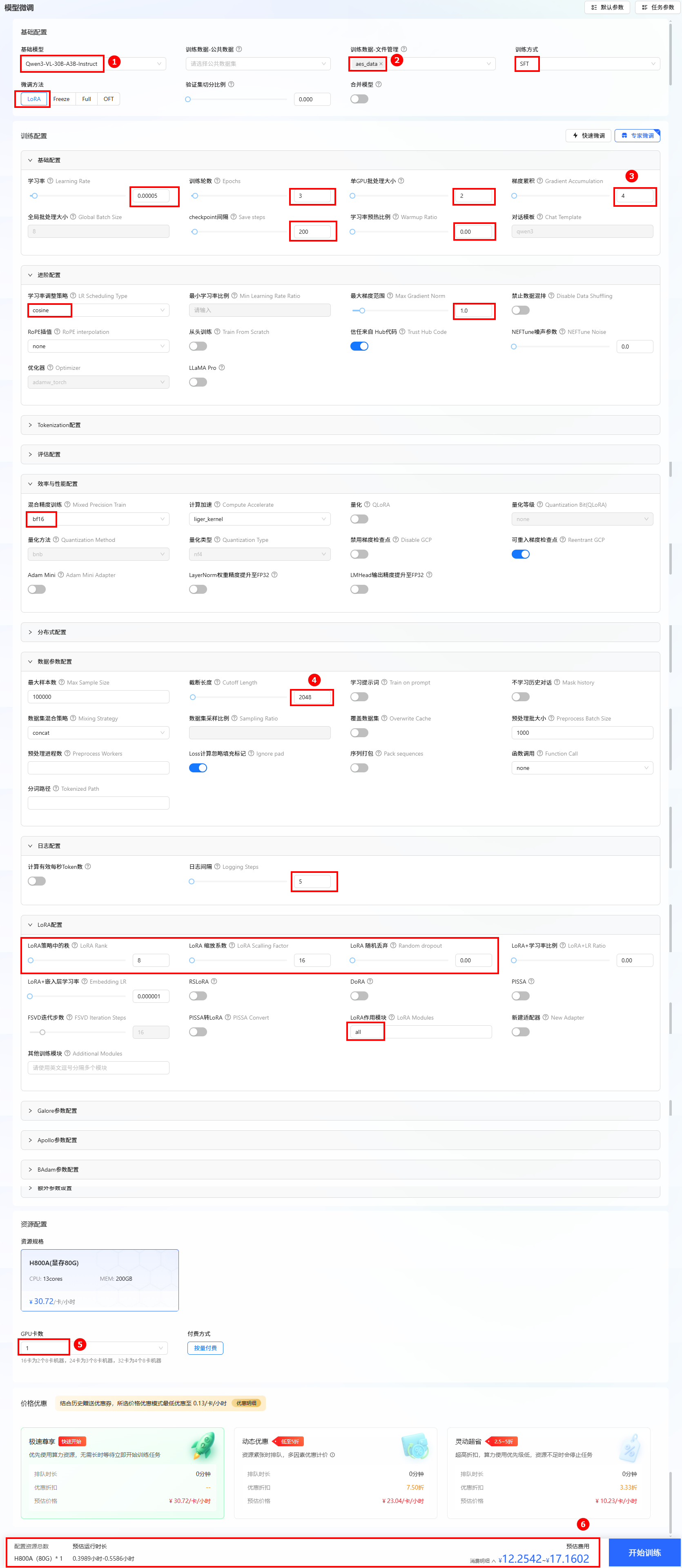 在LLaMA-Factory Online平台上,我们采用LoRA微调方法,仅用单张H800A GPU、45分钟就完成了模型训练,显著降低了计算成本。关键配置参数如下:
