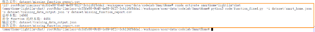 进入“SmartHome”文件夹,新建终端,激活 Python 环境 smarthome-lightllm-caht ,在命令行输入以下指令运行脚本,完成数据集的“funcion”字段补全。