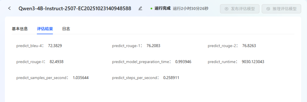 训练完成后,可在 LLaMA-Factory Online 上对模型进行全面评估,并查看评估任务的基本信息、日志及结果: