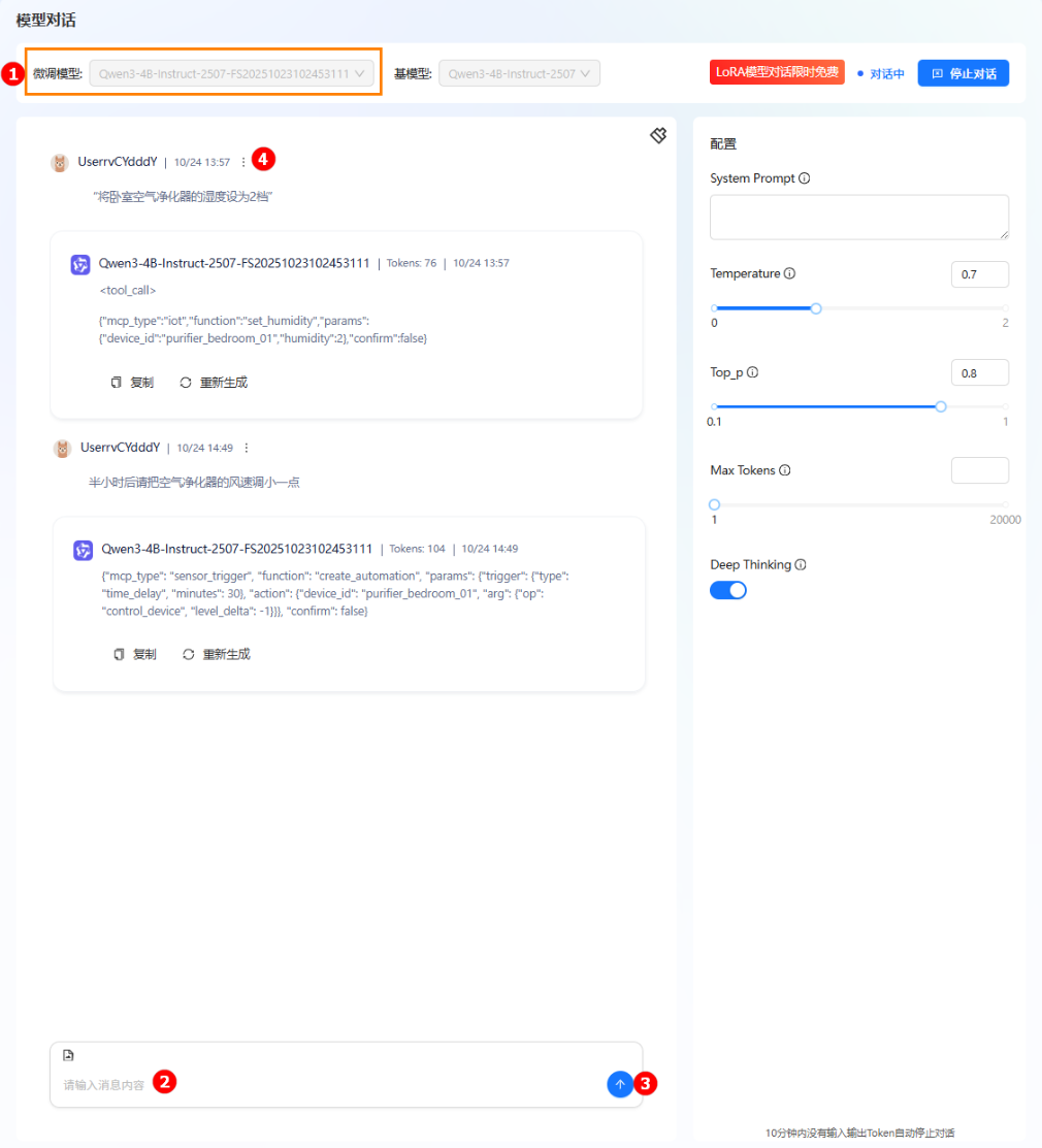 在“模型对话”界面选择微调后的模型,即可实时体验复杂指令解析:
