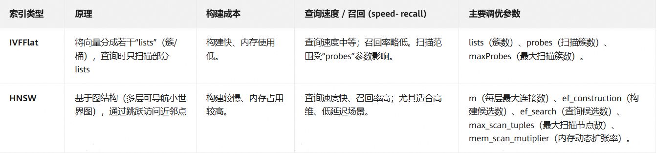 - ivfflat索引构建时间更短,主要受构建参数lists影响,对数据量不敏感。相同数据量和维度场景下查询耗时及召回率表现低于hnsw