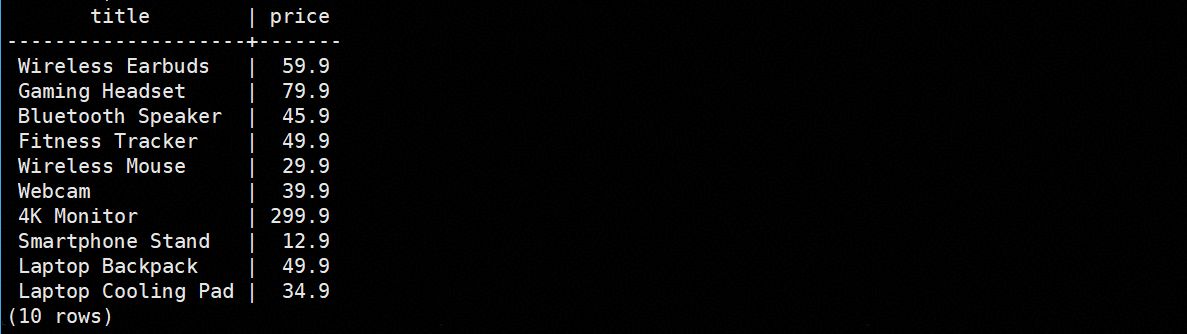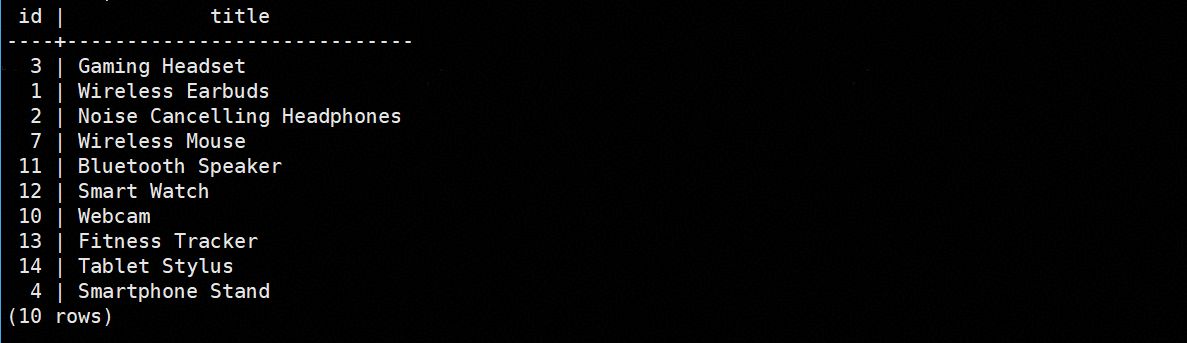 INSERT INTO products (title, description, price, embedding) VALUES ('Wireless Earbuds', 'Bluetooth wireless earbuds with charging case', 59.9, '[0.12, 0.34, -0.21, ...]'), ('Noise Cancelling Headphones', 'Over-ear headphones with active noise cancellation', 129.9, '[0.11, 0.36, -0.19, ...]'), ('Gaming Headset', 'Wired gaming headset with microphone', 79.9, '[0.10, 0.33, -0.25, ...]'), ('Smartphone Stand', 'Adjustable phone stand for desk use', 12.9, '[0.45, -0.12, 0.08, ...]'), ('USB-C Charger', 'Fast charging USB-C power adapter', 19.9, '[0.42, -0.15, 0.05, ...]'), ('Mechanical Keyboard', 'Mechanical keyboard with blue switches', 89.9, '[0.55, 0.02, -0.31, ...]'), ('Wireless Mouse', 'Ergonomic wireless mouse', 29.9, '[0.53, 0.01, -0.28, ...]'), ('Laptop Backpack', 'Water-resistant laptop backpack', 49.9, '[0.60, -0.05, -0.10, ...]'), ('4K Monitor', '27-inch 4K UHD computer monitor', 299.9, '[0.58, 0.04, -0.35, ...]'), ('Webcam', 'HD webcam for video conferencing', 39.9, '[0.52, -0.01, -0.20, ...]'), ('Bluetooth Speaker', 'Portable Bluetooth speaker with deep bass', 45.9, '[0.14, 0.30, -0.18, ...]'), ('Smart Watch', 'Fitness tracking smart watch', 99.9, '[0.20, 0.40, -0.22, ...]'), ('Fitness Tracker', 'Lightweight activity and sleep tracker', 49.9, '[0.22, 0.38, -0.24, ...]'), ('Tablet Stylus', 'Stylus pen for tablets', 25.9, '[0.48, -0.10, 0.12, ...]'), ('Laptop Cooling Pad', 'Cooling pad with dual fans', 34.9, '[0.57, -0.02, -0.15, ...]'); -