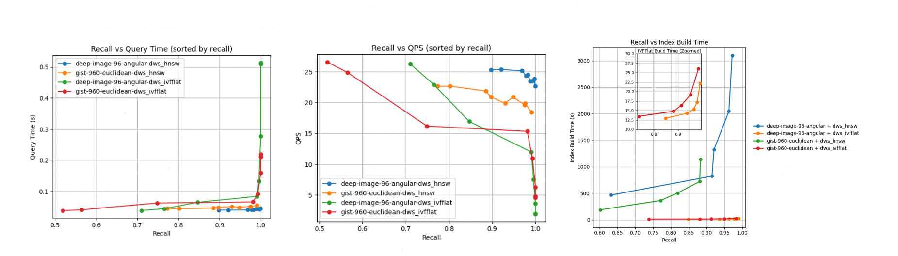 以下图示展示了dws pgvector插件在不同数据集及索引下的检索性能