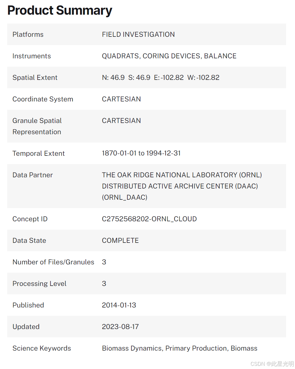 该数据集包含三个 ASCII 文件(.txt 格式)。其中两个文件包含北部混合草原的地上和地下生物量及生产力数据,一个文件对应未放牧处理,另一个文件对应重度放牧处理。研究地点(北纬 46.90 度,西经 102.82 度,海拔 784 米)位于北部大平原,靠近迪金森市,距北达科他州俾斯麦市以西约 160 公里。第三个文件包含 1891 年至 1994 年期间的气候数据,数据来自迪金森市附近的一个气象站(北纬 46.88 度,西经 102.80 度,海拔 750 米)。