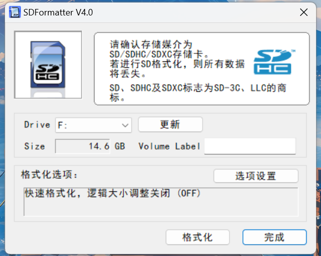 下载并安装格式化 SD 卡工具(自行搜索),以下操作以 SD Card Formatter(推荐) 格式化工具为例
