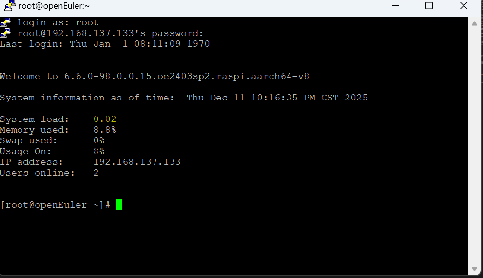 树莓派默认采用 DHCP 的方式自动获取 IP。如果树莓派连接已知路由器,可登录路由器查看,新增的 IP 即为树莓派 IP。例如,树莓派对应 IP 为:192.168.31.109,使用命令 ssh 后输入密码 openeuler,即可远程登录树莓派。