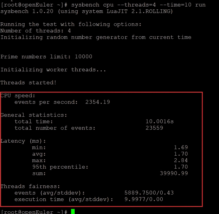 在 Threads fairness 指标中,执行时间的标准差(stddev)为 0.00。这证明 openEuler 的内核调度器能够精准地将计算任务分配给 ARM 处理器的每一个核心,实现了算力的最大化利用。