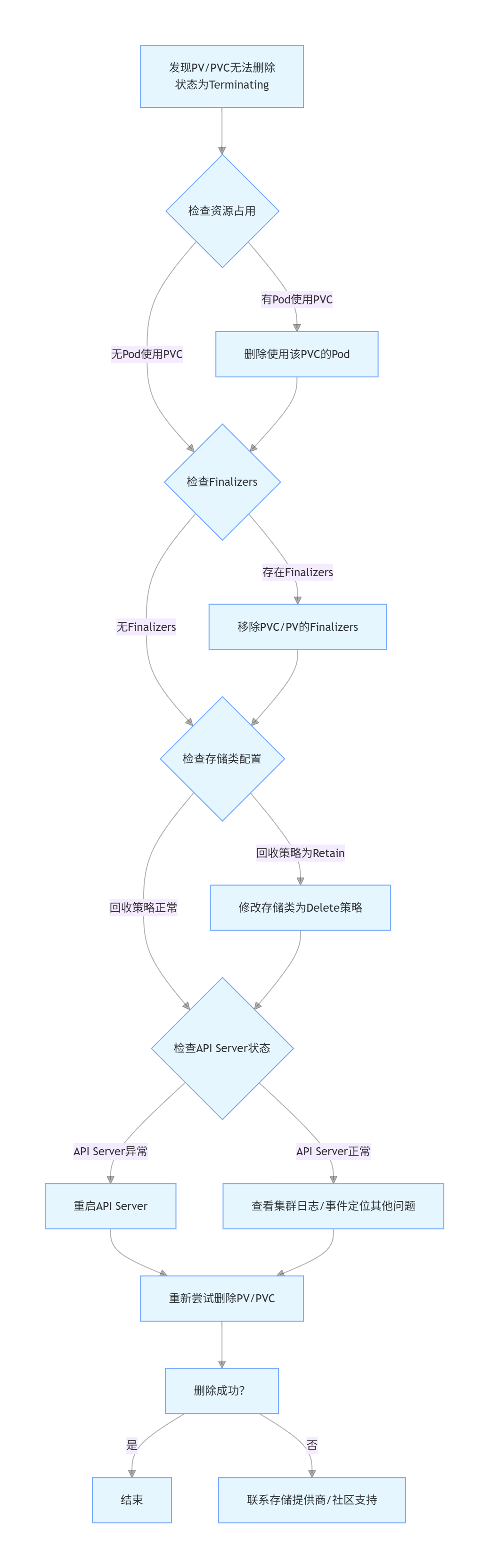 通过以上步骤,你应该能够解决大多数 PVC 无法删除的问题。如果问题仍然存在,建议查看 Kubernetes 的日志和事件以获取更多信息。