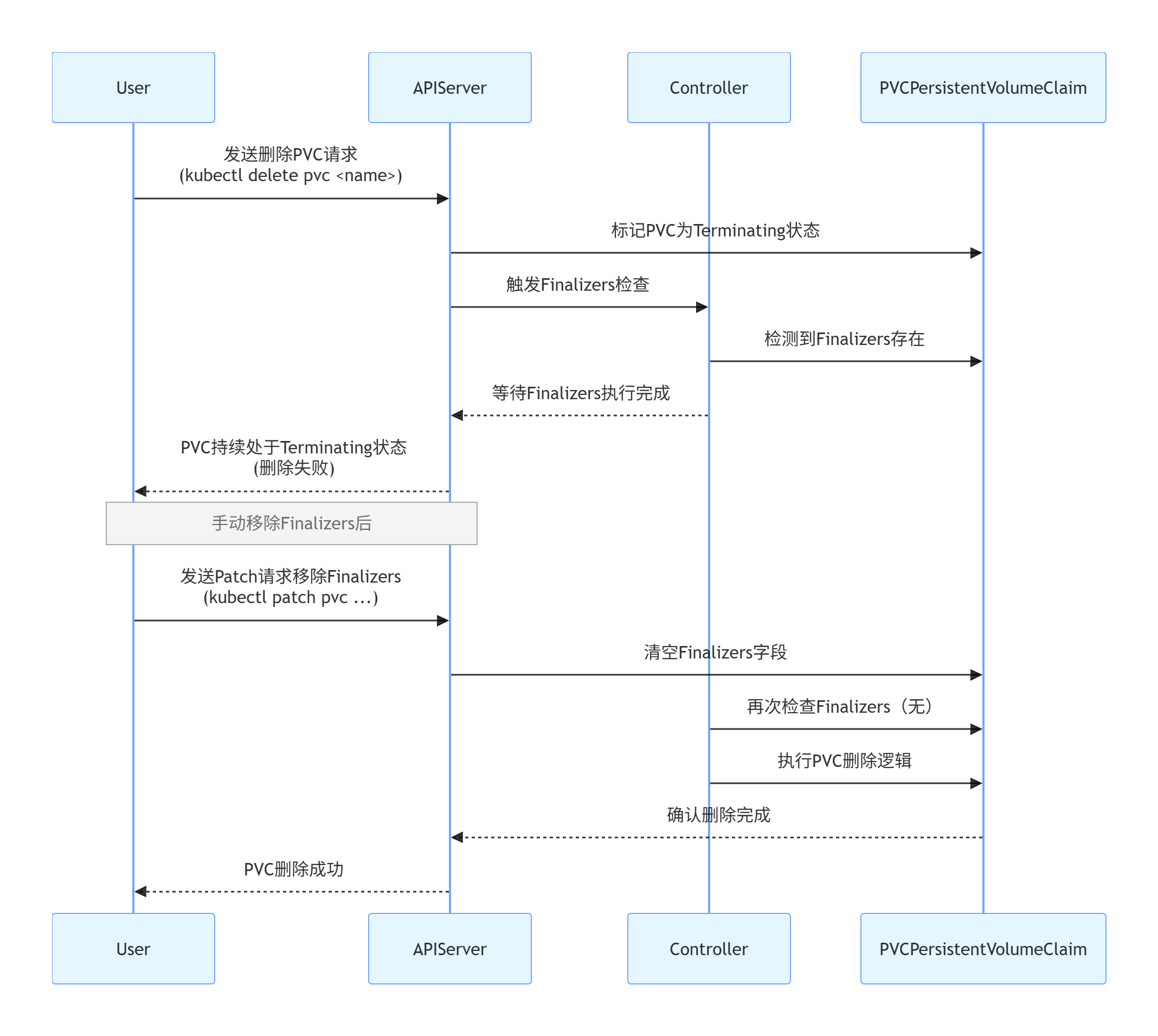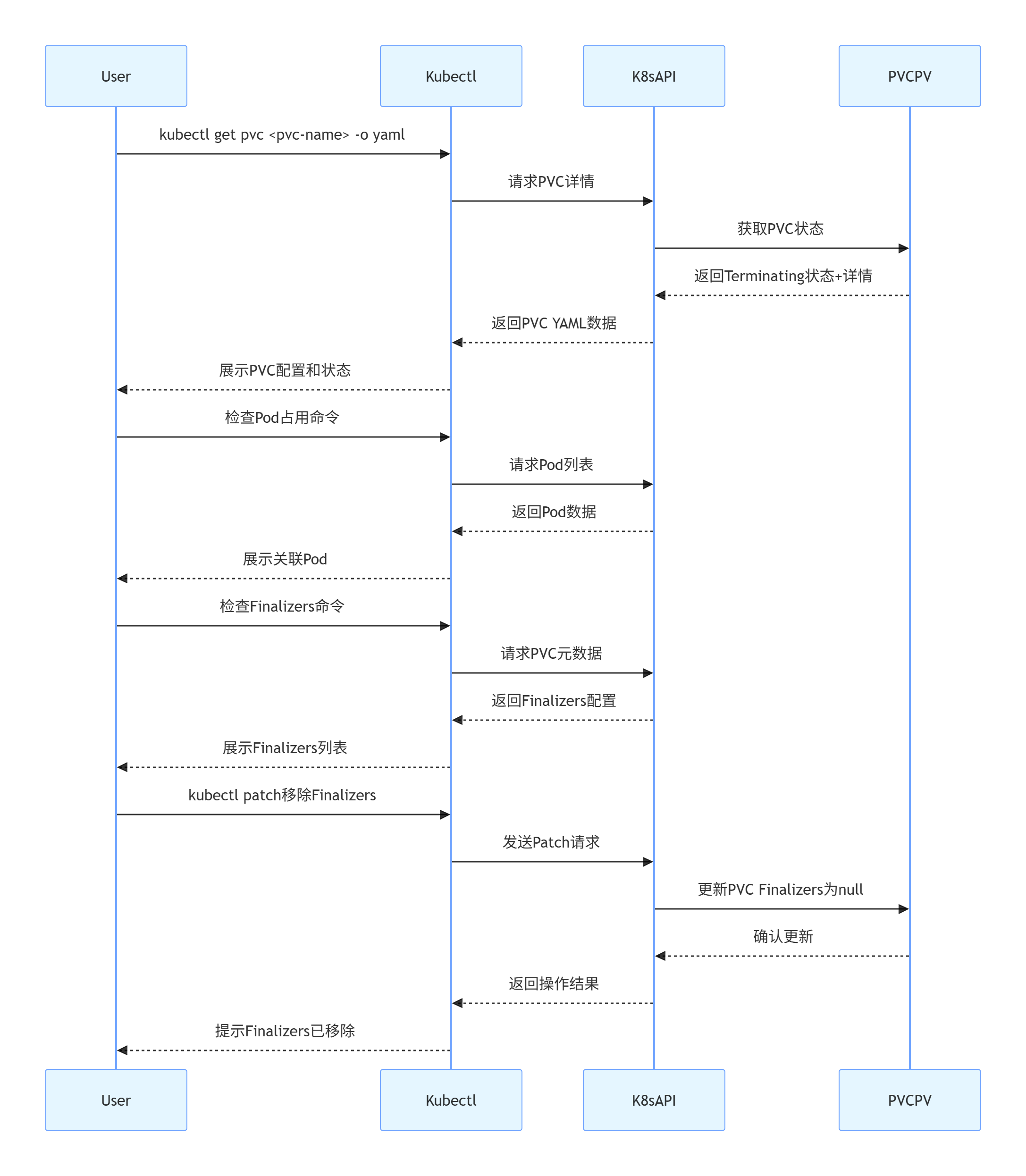 - 检查 Finalizers: 检查 PVC 是否有 Finalizers,这些 Finalizers 可能阻止了 PVC 的删除。