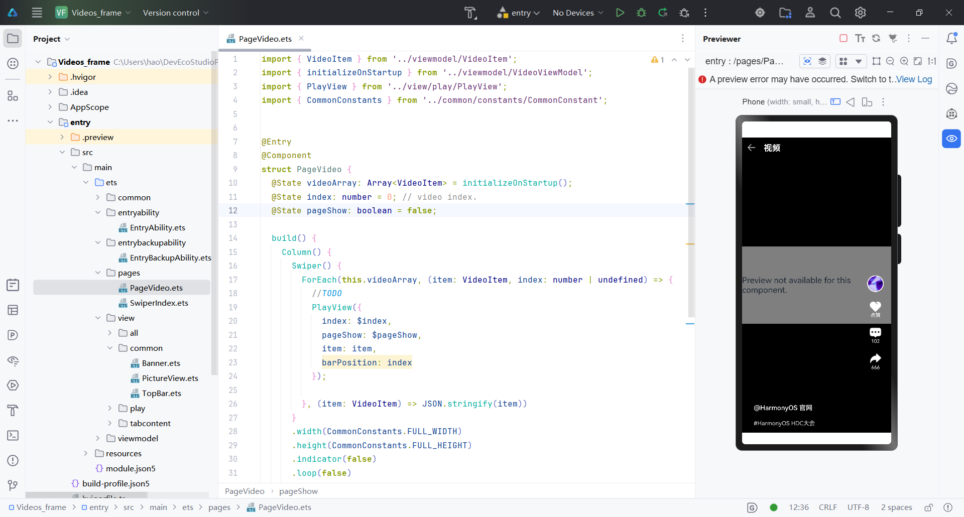 鸿蒙应用入门级开发者认证实验五(短视频应用)