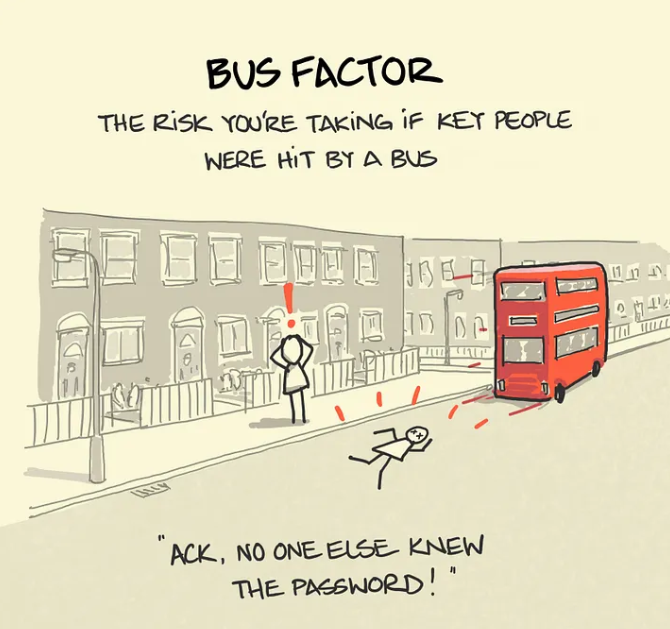 巴士因子:指一个项目在多少关键人员“被巴士撞了”(离职)后会瘫痪。因子越低,风险越高。