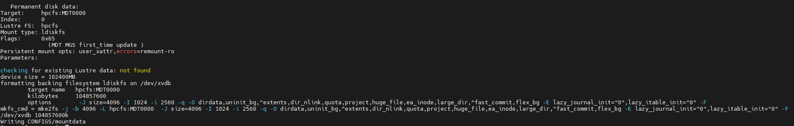 mkfs.lustre --fsname=hpcfs --mgs --mdt --index=0 /dev/xvdb