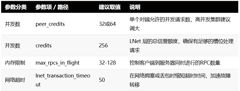 LNet是Lustre的传输基石。在高带宽网络下,默认参数往往无法跑满物理带宽。