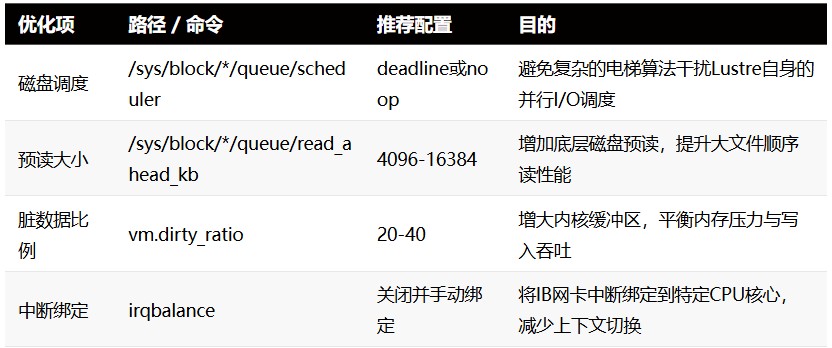 lctl set_param obdfilter.*.brw_size=16将单次RPC的I/O大小从默认的1MB提升至16MB,显著提升大块连续写吞吐量。
