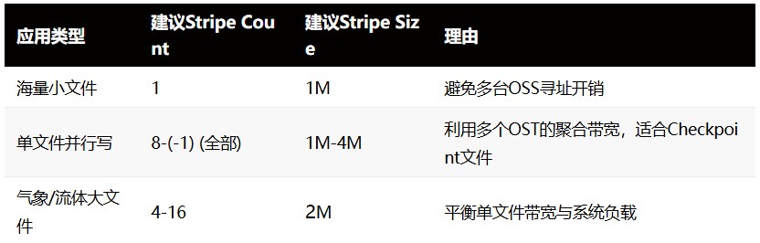 stripe_count=1,减少寻址开销。 - 大文件/高并发场景:增加