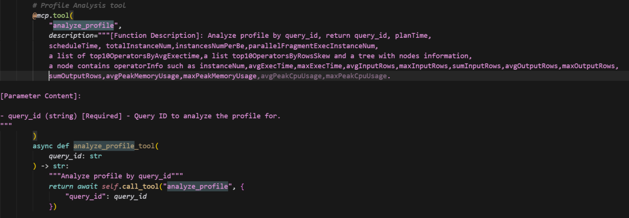 在本场景中,团队主要使用 [Apache Doris 的 MCP],并进行了大量优化,以满足实际需求。例如,增加了用于获取 Profile 的工具、提取 Task 信息的工具及分析审计记录的工具。同时,还将这些工具与自研的 Profile 可视化工具集成到 MCP 中,使其可在 MCP 体系内被调用。下图展示了 MCP 工具扩展的部分示例: