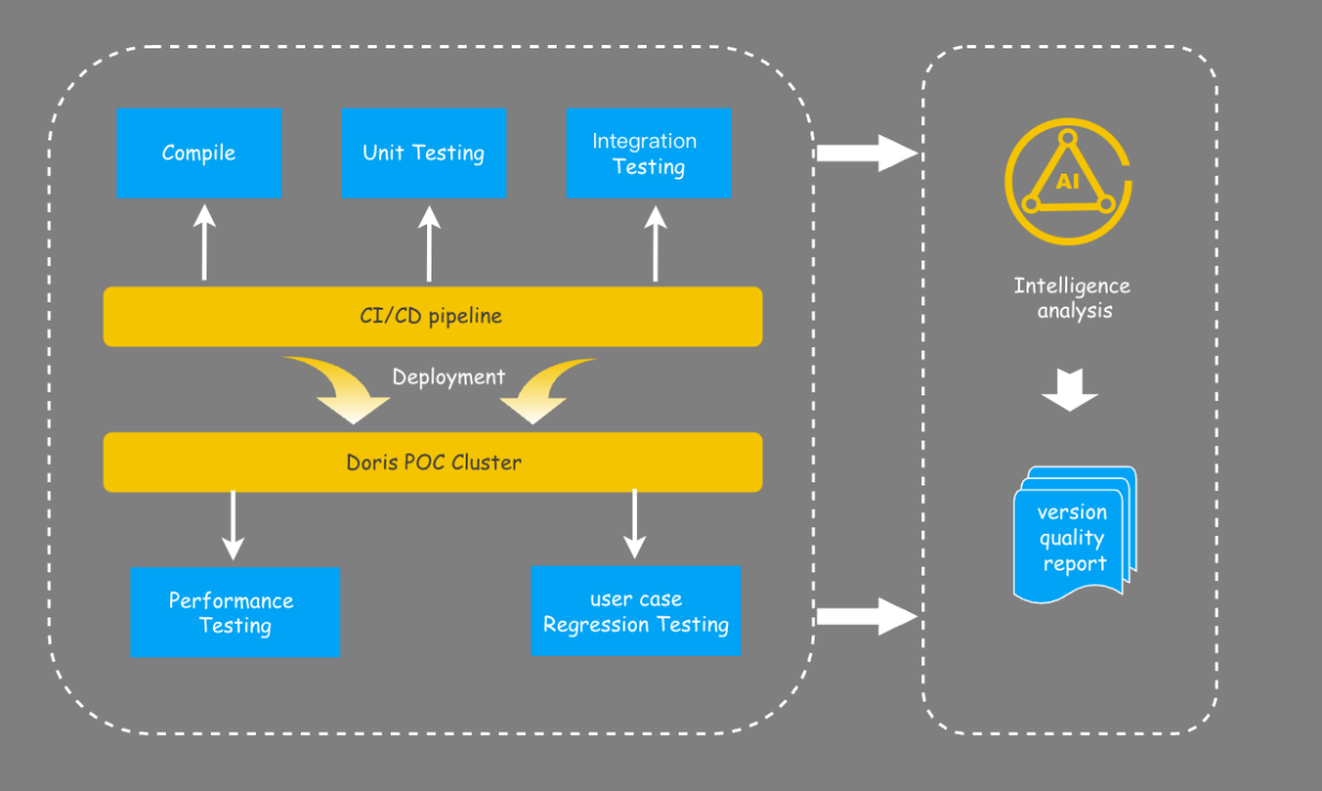 我们建立了一套自动化质量评估体系,主要用于解决前文提到的版本数量多、发版风险高等问题,避免新版本对生产环境造成影响。该体系的主要思想就是在版本发布之后通过自动化流程把 UT、集成测试、性能测试、用户核心 case 都回归测试,再由 AI 对这些结果进行分析,输出诊断结论及相应的优化建议。