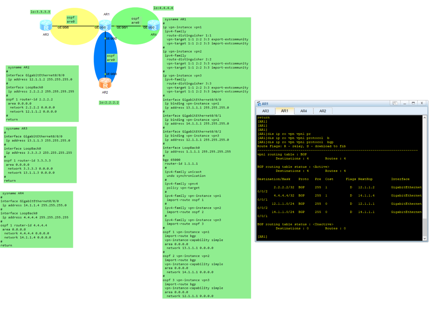 [NE系列路由器-bgp] import-rib vpn-instance vrf1 // 关键命令,将VRF1路由引入公网BGP