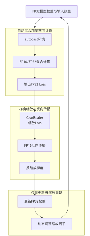 在传统全精度训练(FP32)中,模型参数与梯度都以 32 位浮点数形式存储与计算,虽然精度高,但显存与计算开销巨大。 混合精度训练(AMP) 的核心思路是: