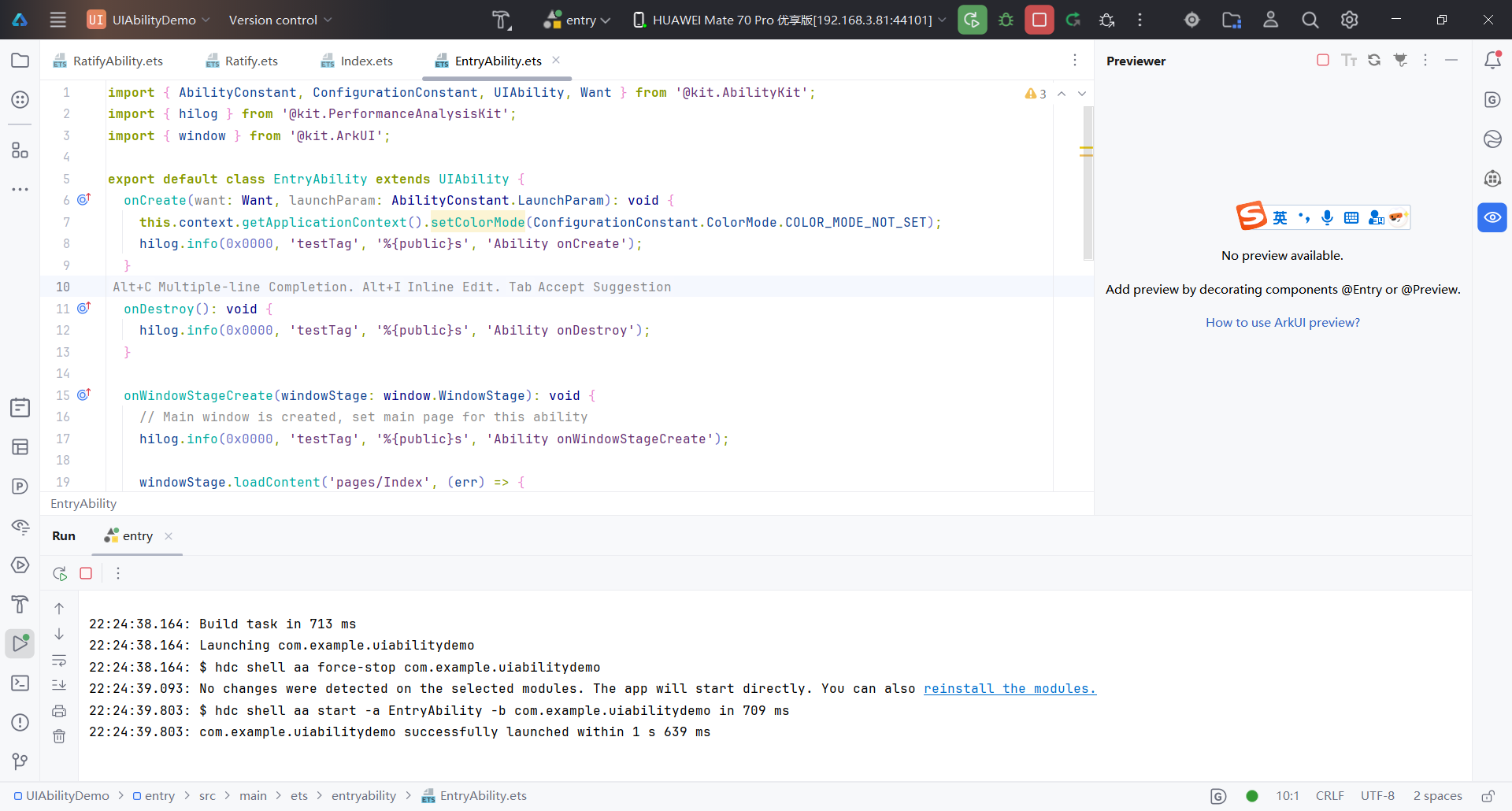 “Preview”即预览功能在鸿蒙开发中无法运行涉及Ability的应用。预览器(Previewer)主要用于UI组件的实时或动态预览,但它不会执行Ability的生命周期(如onCreate、onDestroy等)。这意味着任何依赖Ability初始化的功能(如后台服务、页面跳转逻辑)在预览模式下都无法正常运作。