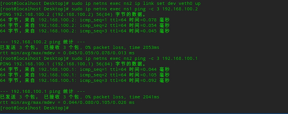 sudo ip netns exec ns1 ping -c 3 192.168.100.2