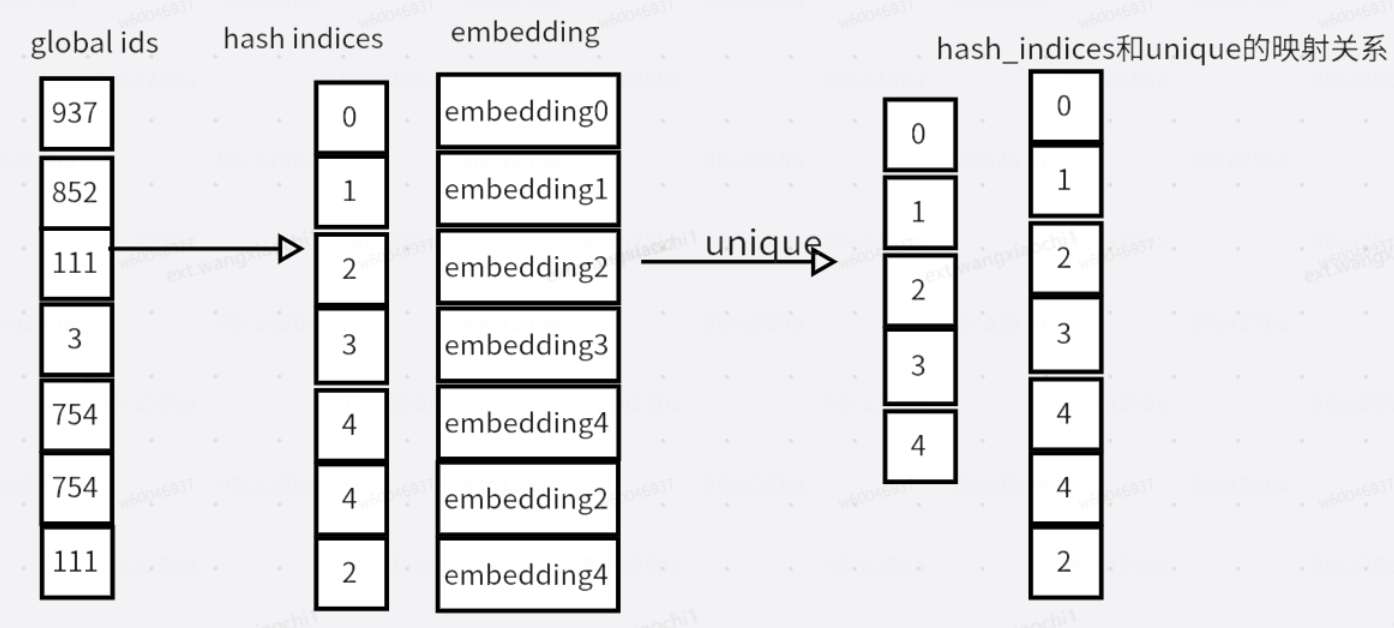 如下图所示:在推荐系统中,大部分ID的原始特征都是离散型(global ids),因为其取值空间巨大且稀疏(如用户ID或物品ID可能达到百万甚至亿级别),直接作为输入会导致嵌入表维度爆炸,引发存储和计算瓶颈。常见的做法是需要将离散的ID转为连续的行号(hash indices),从而压缩特征空间,实现高效存储和查询。
