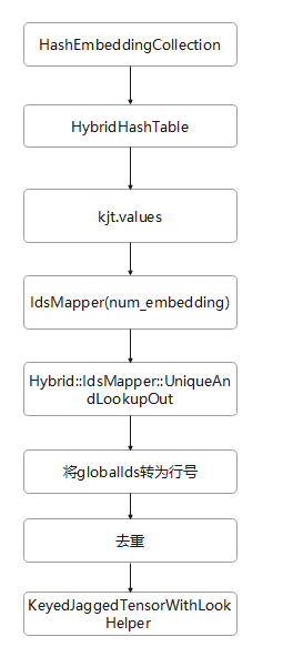 从HashEmbeddingCollection开始,通过HybridHashTable直接进行ID到嵌入向量的转换。使用IdsMapper进行ID映射和去重,将原始稀疏 ID(如用户 ID)转换为 embedding 表内部索引,然后直接生成嵌入向量。具体流程图如下图所示: