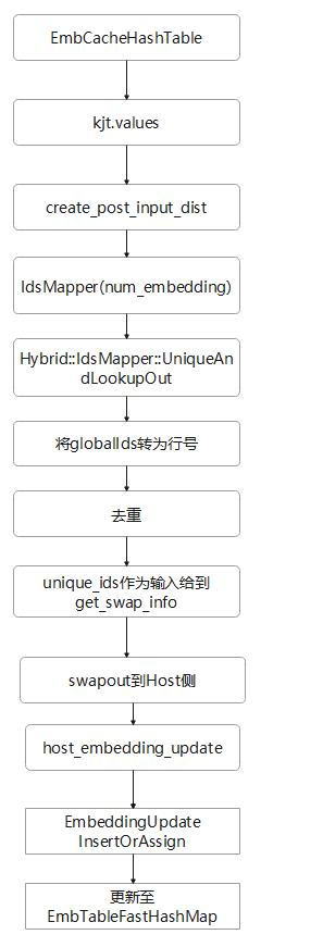 在双层架构下,Hash 表的管理引入了缓存管理相关组件,以提升整体性能与一致性。整个流程中,输入数据首先通过 IdsMapper 将全局 ID 映射为嵌入表(Embedding Table)的行号,并完成去重操作。随后,通过动态管理接口 EmbeddingUpdate 的 InsertOrAssign 操作,将更新后的嵌入值插入或覆盖至主机内存中的嵌入表。