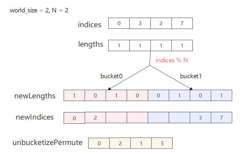 如下图为分布式训练中以 world_size=2 和桶数N=2 为例,数据分桶的详细流程:初始输入包括查表的indices张量(如[0, 3, 2, 7])和查表的偏移长度lengths张量(如[1, 1, 1, 1]),通过取模运算(indices % bucket)将数据分桶到bucket0和bucket1(例如索引0和2分配到bucket0,索引3和7分配到bucket1)。分桶后生成newIndices张量(如[0, 2, 3, 7])和newLengths张量(如[1, 1, 0, 0, 0, 0, 1, 1]),同时在多卡训练时,会对没有分配到当前卡的位置进行补0处理;当启用序列模式时,unbucketizePermute张量(如[0, 2, 1, 3])用于恢复原始索引顺序。这种设计通过补零和仅处理有效索引,避免了传统偏移方法的标量计算开销,提升了多卡训练效率。