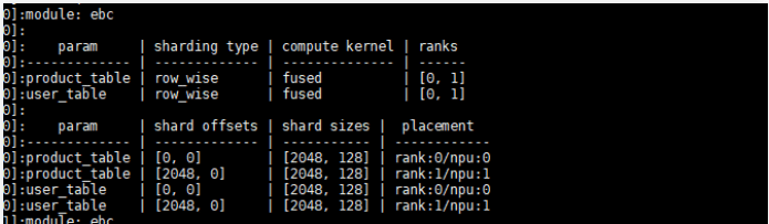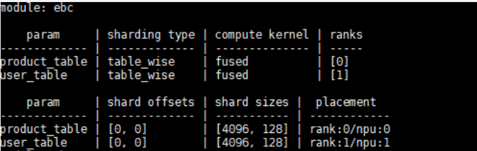 如图所示,该输出展示了“ebc”模块在行分片策略下的具体分片配置。两个嵌入表均采用了 row_wise分片类型和 fused融合计算内核——该内核专为大规模稀疏嵌入场景设计,通过算子融合和内存优化显著提升计算效率。