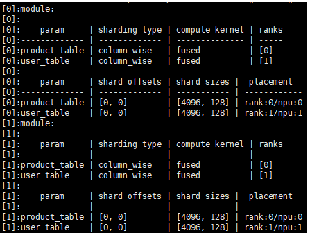 以下内容展示了基于“ebc(Embedding Bag Collection)”模块在分布式环境下的分片配置信息。实验环境包含两个计算设备(rank:0 和 rank:1),EmbeddingBagCollection 中共有两个嵌入表:product_table 和 user_table,均采用fused融合计算内核——该内核专为大规模稀疏嵌入场景设计。本示例在不同分片策略配置下展示了不同的切片效果, 具体实现如下: