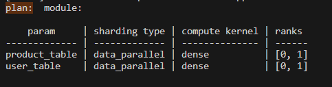 # constrans = {"product_table": ParameterConstraints(sharding_types=["table_wise"]), "user_table": ParameterConstraints(sharding_types=["table_wise"])}