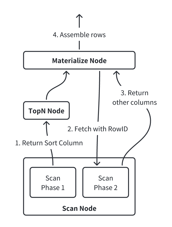 新增的 MaterializeNode 接收第一阶段的结果后,会根据 __DORIS_ROWID_COL__ 向对应 Backend 发起基于行号(RowID)的数据拉取请求。借助文件中记录的位置信息,Doris 可以快速定位并读取对应记录;由于已完成 TopN 计算,第二阶段通常只需读取有限行(例如示例中的 10 行)。