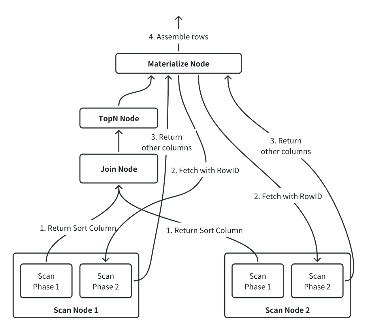 得益于该阶段可通过 RPC 跨节点执行,打破了单节点执行限制,两阶段访问机制也自然扩展至多表关联的 TopN 场景,例如: